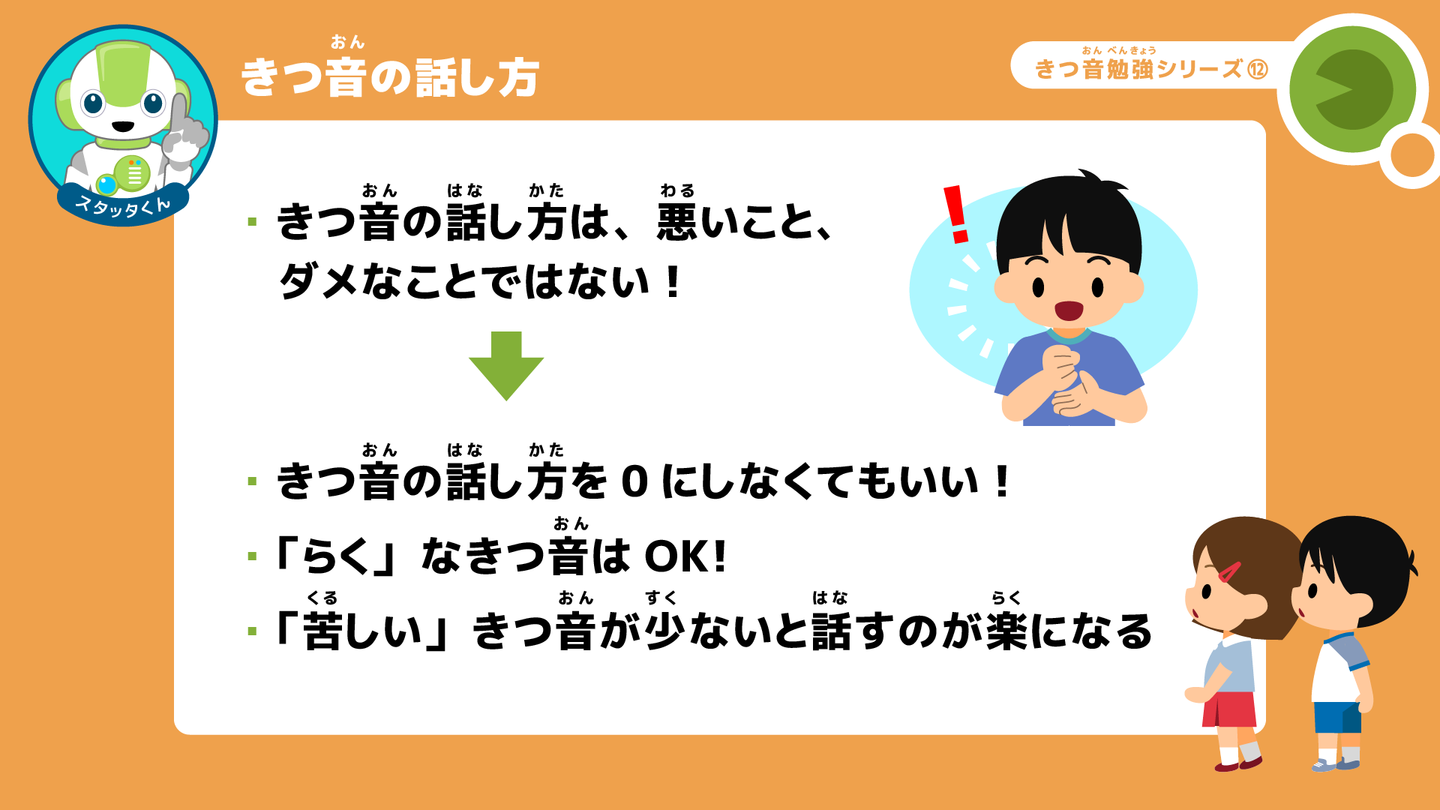 スタッタくん: 「きつ音になりにくい話し方」の勉強の前に、もう一度、これまで勉強していたことを復習しよう。