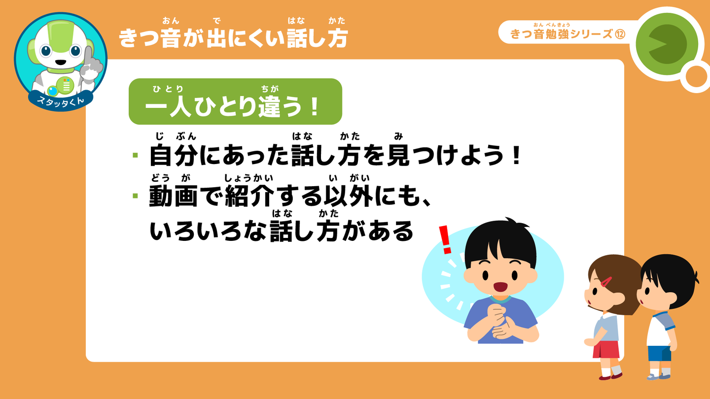 スタッタくん: 二つ目は、きつ音が出にくい話し方は、いろいろあって、どの方法が合うかは、吃音のあるお友達、一人一人違うんだったよね。