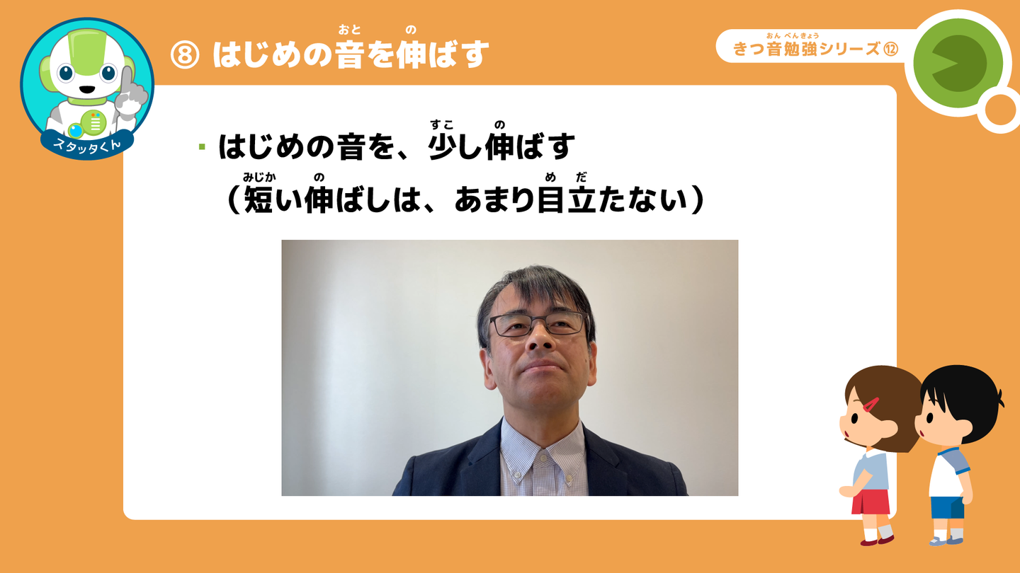 スタッタくん: 8つ目は、「はじめの音を伸ばす」だよ。