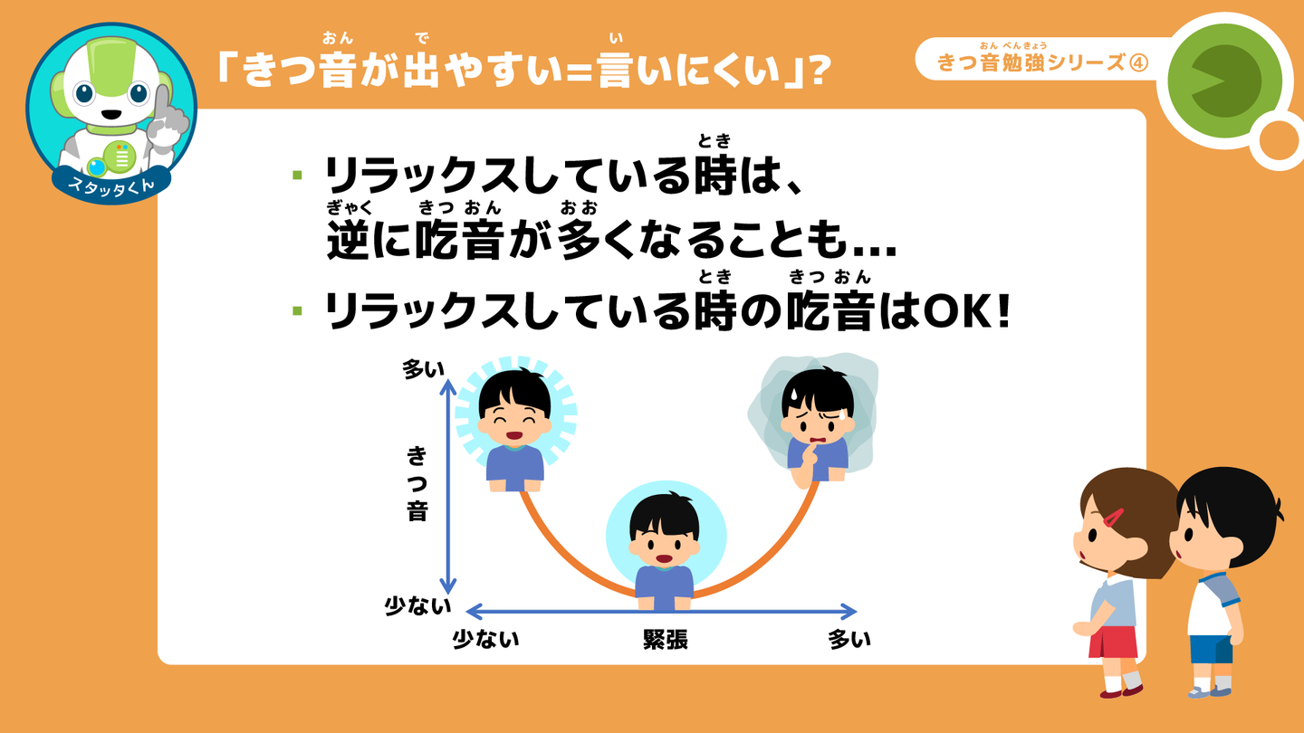スタッタくん: うん。もちろん、吃音のあるお友達は、「吃音が出やすい」と、言いにくくて、困る時が多いんだけど、吃音って、例えば、お家の人や親しい友達とおしゃべりするなどリラックスしている時に、多くなることもあるんだ。