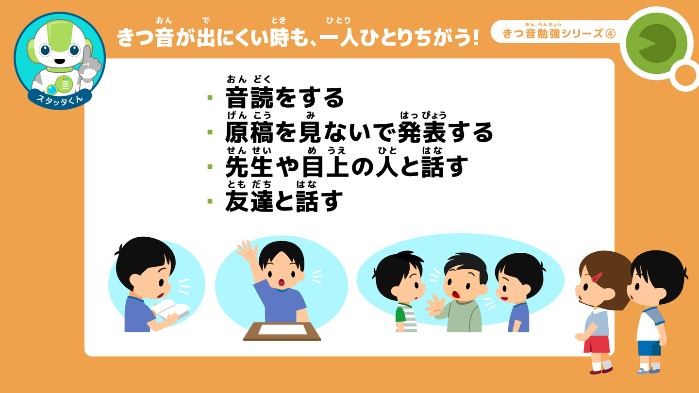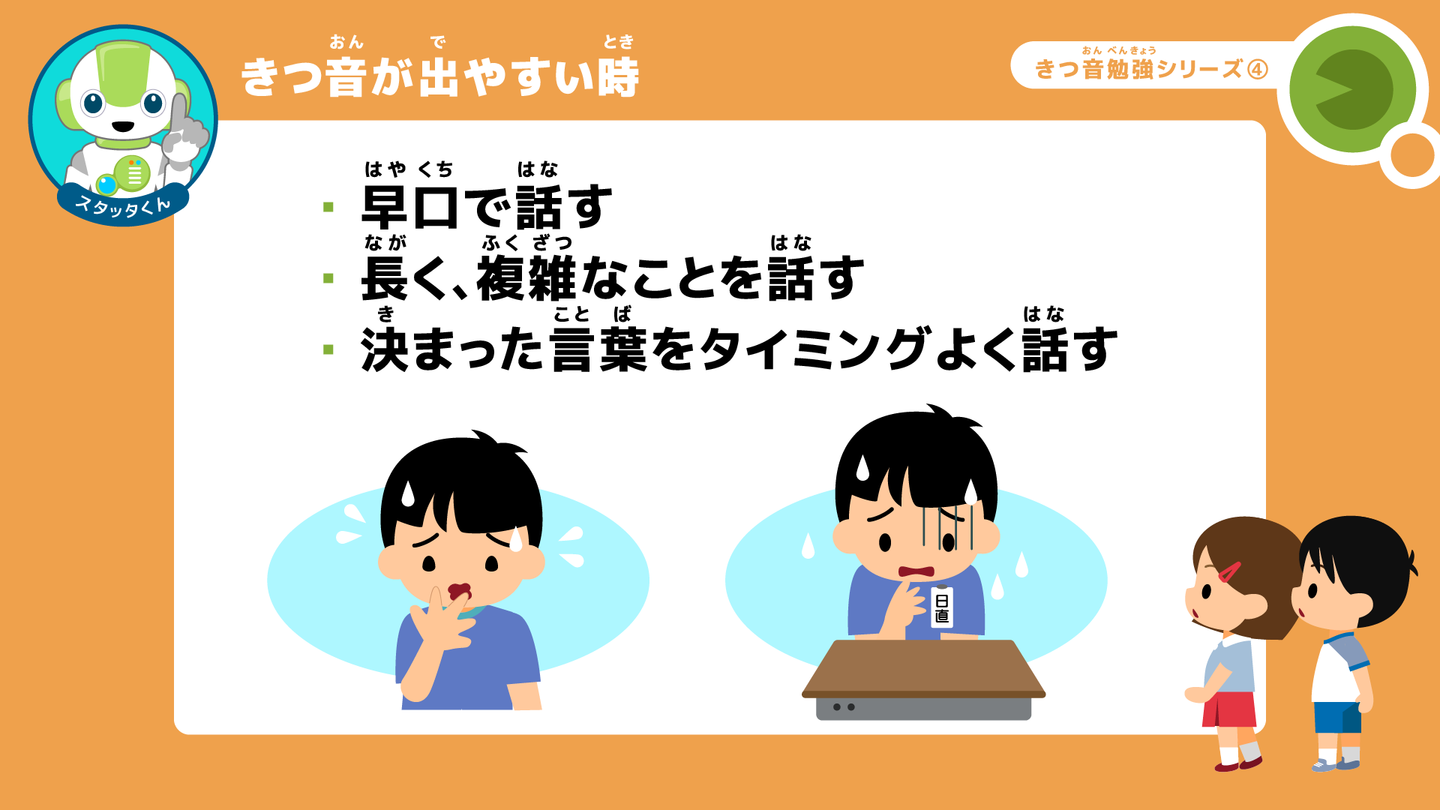 スタッタくん: 例えば、健康調べで「はい、元気です。〇〇さん」と前の人に続けてテンポ良く話す時や、授業の開始の号令を、「きりつ」、「今から、1時間目の勉強を始めます」、「着席」とスラスラと話したりする時とかだよ。
