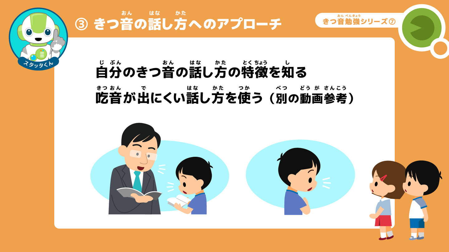 スタッタくん: 吃音を楽にする方法の3つ目は、吃音の話し方へのアプローチだよ。