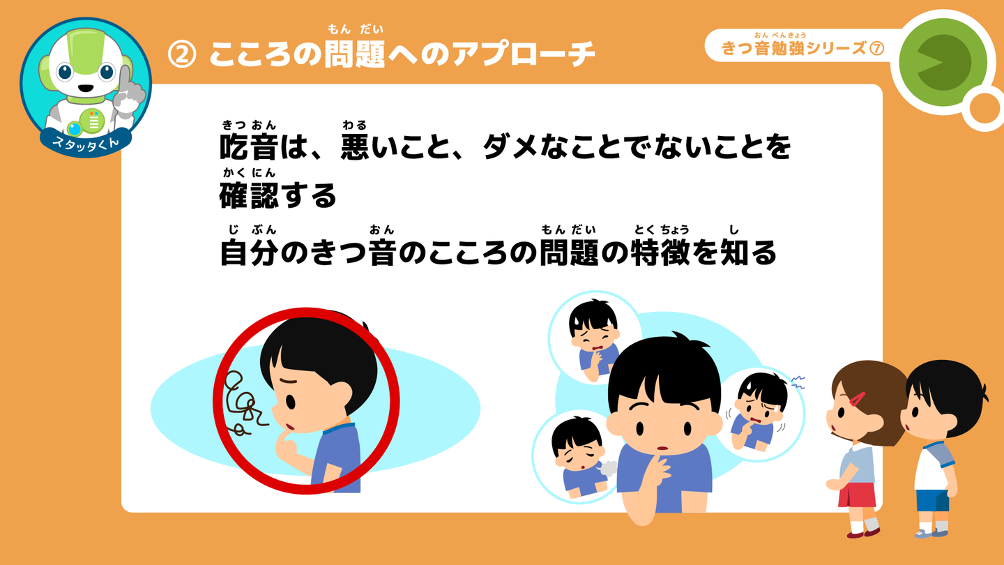 スタッタくん: うん。吃音のあるお友達は、吃音への不安や緊張を感じながら、それでも、頑張って、発表したり、クラスの仕事をしたり、先生やお友達とお話したりしてるよね。