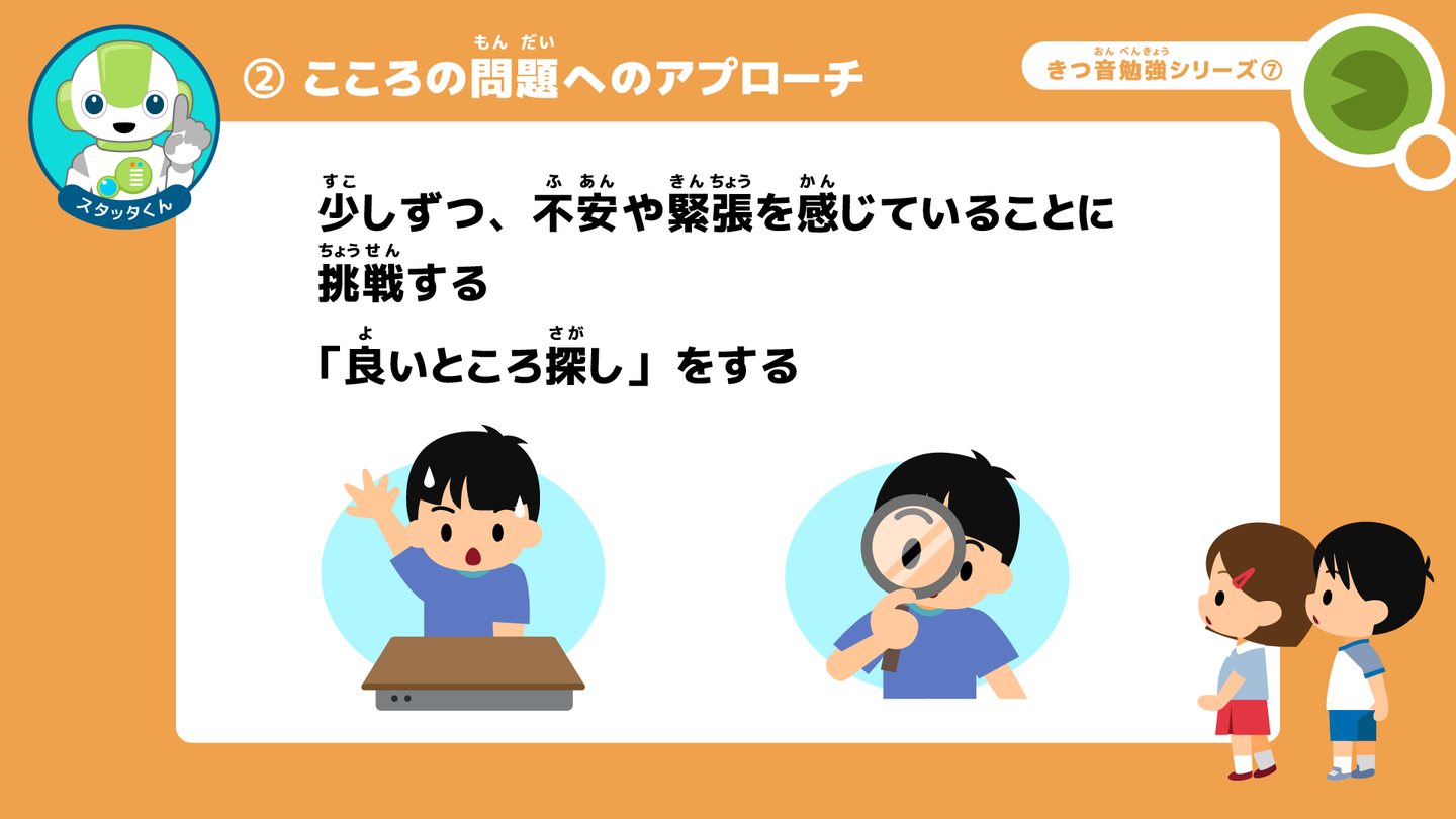 スタッタくん: 二つ目は、こころの問題へのアプローチだよ。