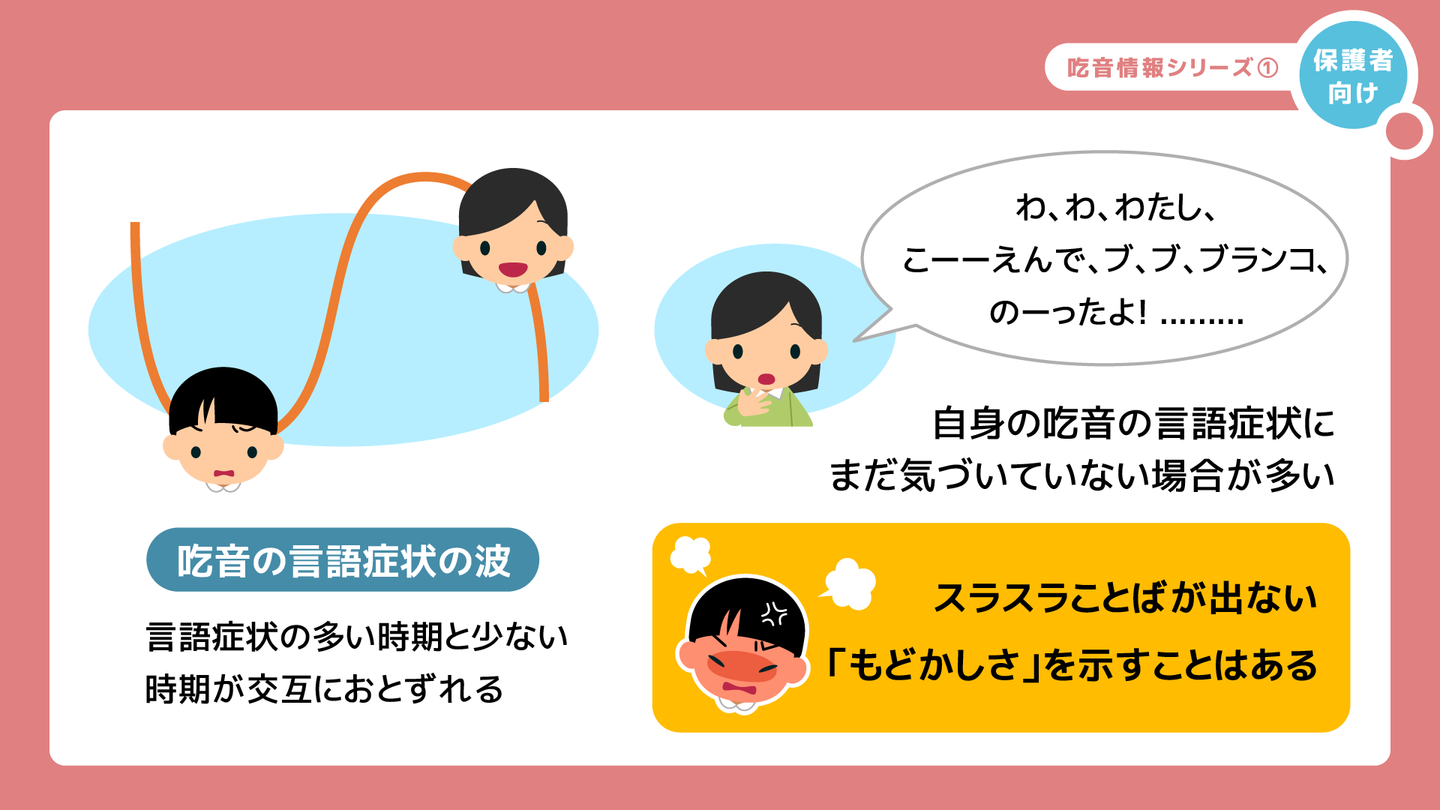 吃音の特徴の一つに、吃音の言語症状の多い時期と少ない時期が交互におとずれる「吃音の言語症状の波」があります。特に、幼児期は、言語症状の波の幅が大きく、言語症状の少ない時期に、全く言語症状が出なくなることも少なくありません。