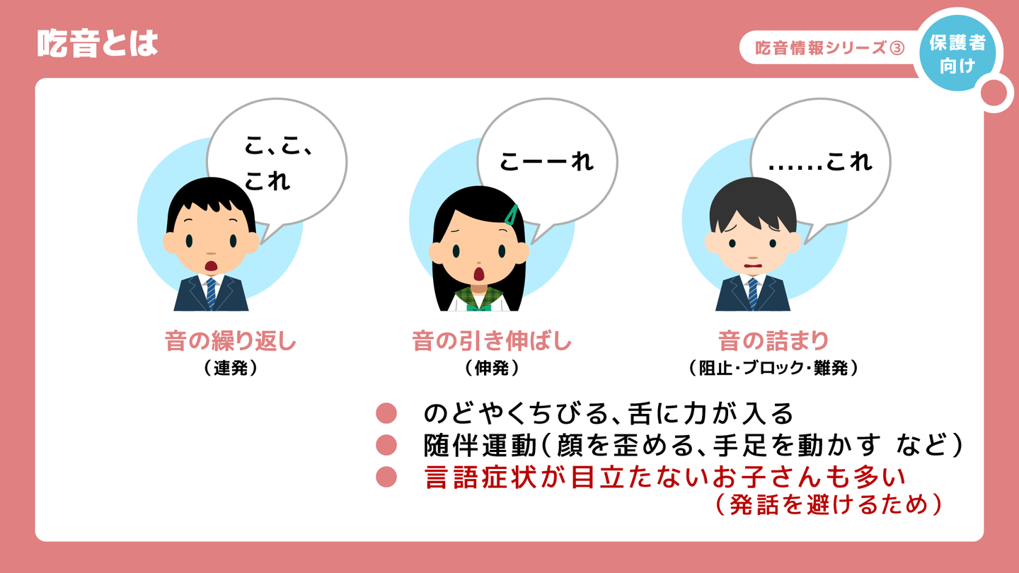 なお、中高生のお子さんの中には、これらの言語症状が目立たないお子さんも多くいます。中には、ほとんど言語症状は見られないというお子さんもいます。これは、この後のスライドで説明する心理症状が大きく、吃音になりそうな音や言葉を他の言葉に置き換えたり、話すことをやめてしまっていたりするためと考えられます。そのため、中高生の時期は、吃音の言語症状だけで、吃音の有無や困難度を判断しないようにする必要があります。