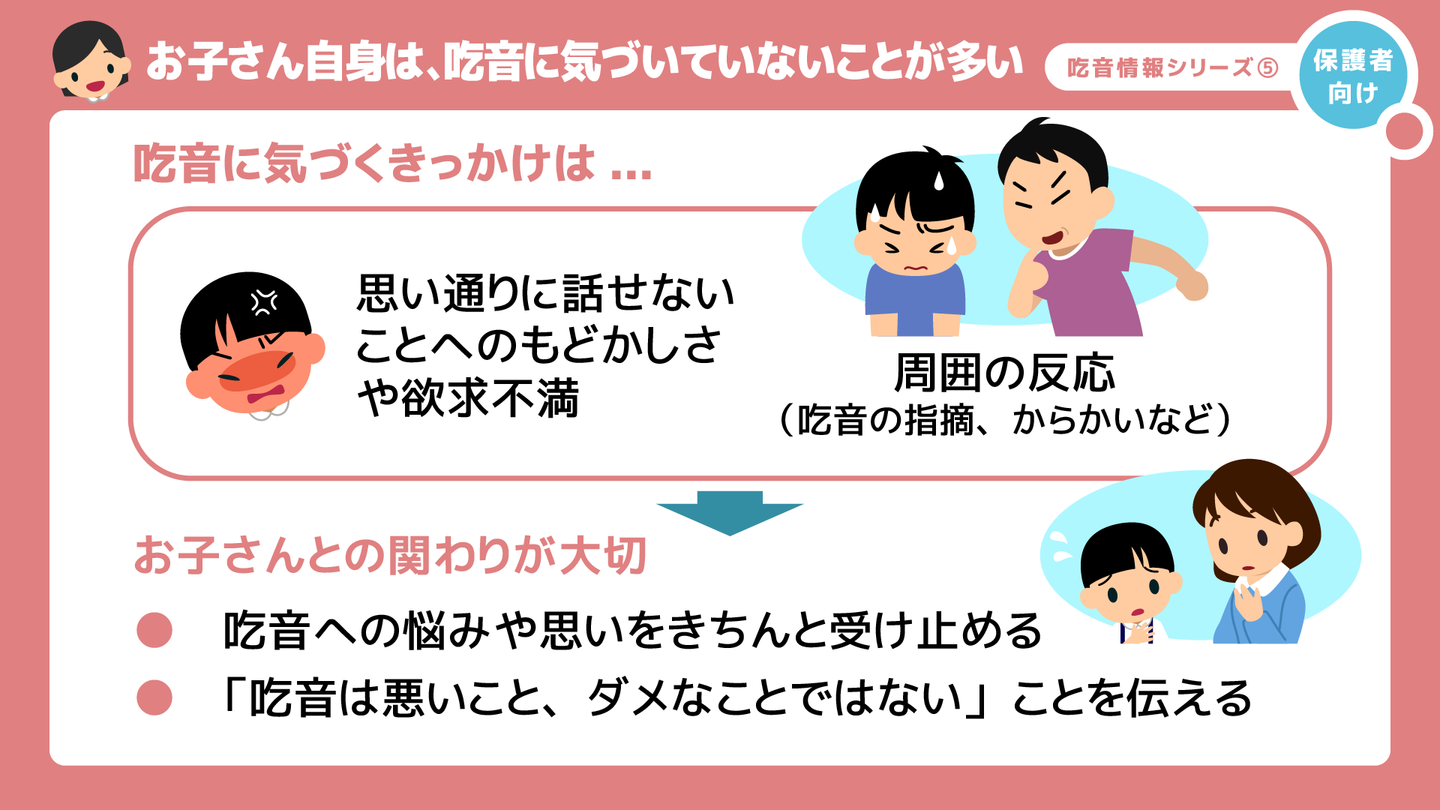そして、お子さんが吃音に気づくのは、思い通りに話せないことへのもどかしさや欲求不満や、吃音に対する指摘やからかいなど、お子さんの周囲にいる人の反応がきっかけになる場合が多いようです。