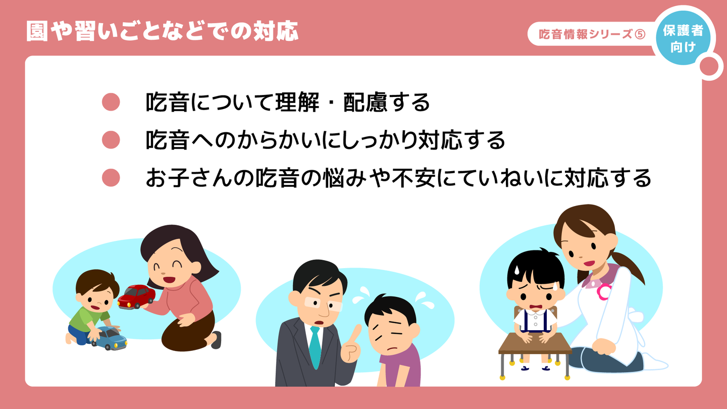 - 吃音のからかいが生じた際は、しっかりご対応いただく