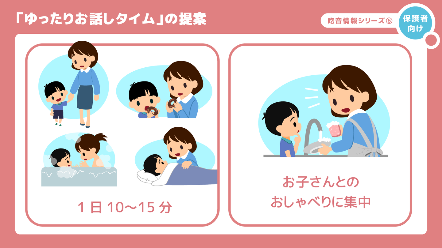 1つ目は、「ゆったりお話しタイム」です。これは、1日、10分から15分程度、家事やスマホをせずに、お子さんとのおしゃべりに集中する時間を設けるという提案です。ゆったりお話しタイムは、園からの帰り道やおやつタイム、お風呂、寝かしつけの時間など、保護者の方も、ホッとできる時に設けると良いでしょう。ごきょうだいがいる場合は、可能であれば、ご家族にご協力いただき、吃音のあるお子さんと1対1の時間が取れると理想的だと思います。しかし、難しい場合は、ごきょうだい一緒でも構いません。また、お忙しく、毎日「ゆったりお話しタイム」を取ることができない場合は、2〜3日に1回とか、可能な範囲で構いません。大切なのは、日々お忙しい毎日の中で、お子さんとゆったりおしゃべりを楽しむ時間を意識的に持つことです。チリも積もれば山となる、ではないですが、1日1日の時間は短くてもコツコツ積み重ねていくことで大きな効果があると思います。
