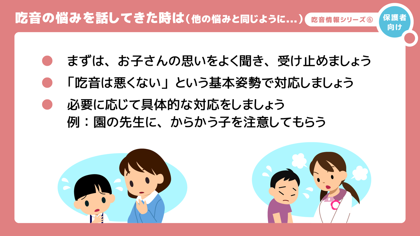 また、必要に応じて具体的な対応、例えば、吃音のことをからかわれたと訴えている場合は、お子さんと相談しながら、園の先生にからかう子を注意してもらう、などしましょう。