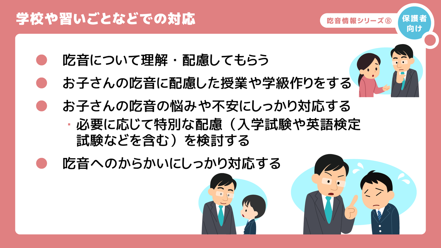 - お子さんの吃音の悩みや不安にしっかり対応いただく。例えば、必要に応じて、日直当番のセリフを吃音が出にくい言葉に変更するなど特別な配慮をご検討いただく。また、必要に応じて、入学試験の面接試験や英語検定試験のスピーキングにおける特別な配慮を申請するなど。