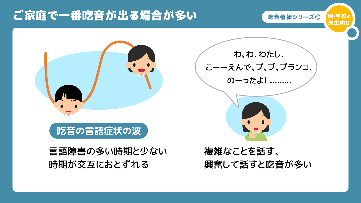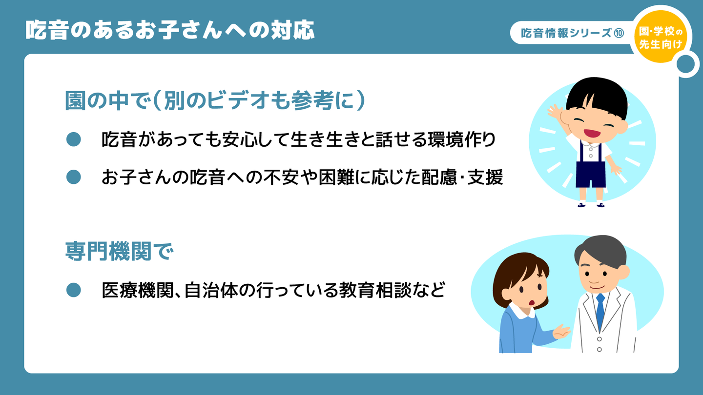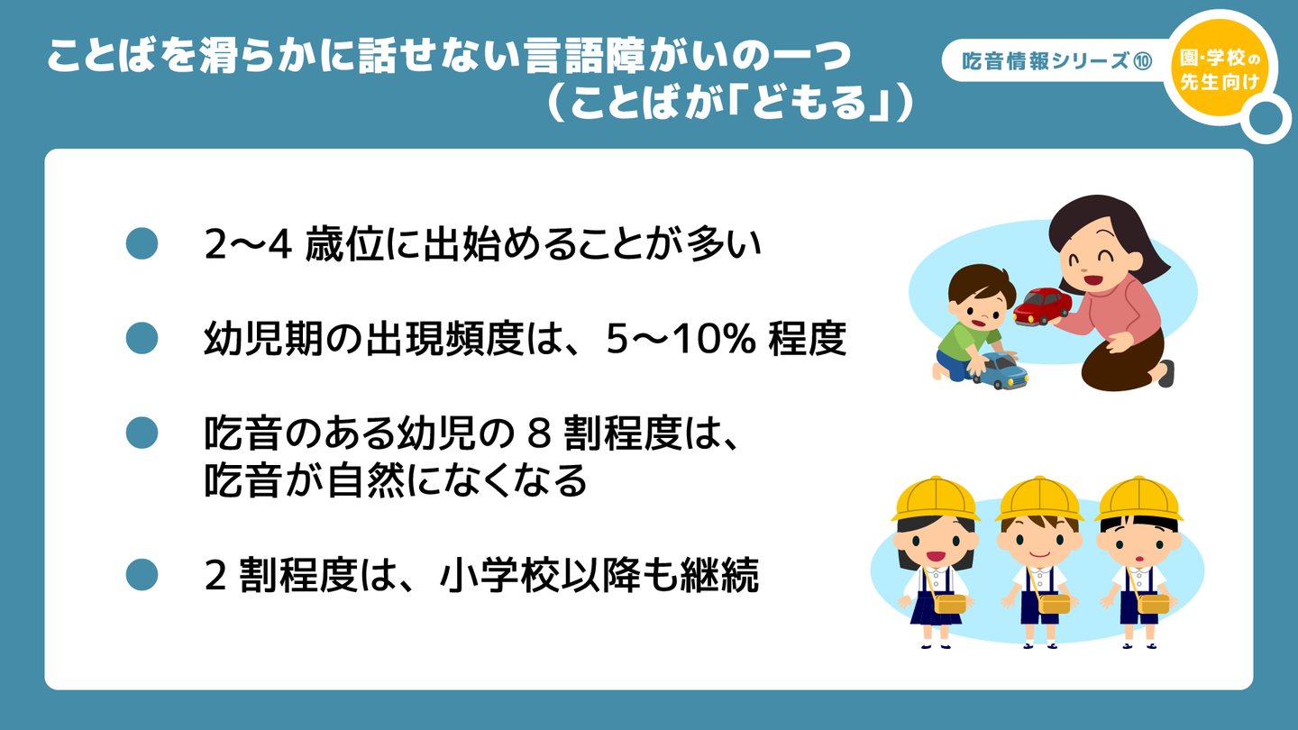 毎日の生活の場である園では、吃音があっても安心して生き生きと話せる環境作りや、お子さんの吃音への不安や困難に応じた配慮・支援が期待されています。園におけるお子さんへの対応については、吃音情報シリーズ(13)「吃音のある子どもへの配慮と支援」もご参照下さい。