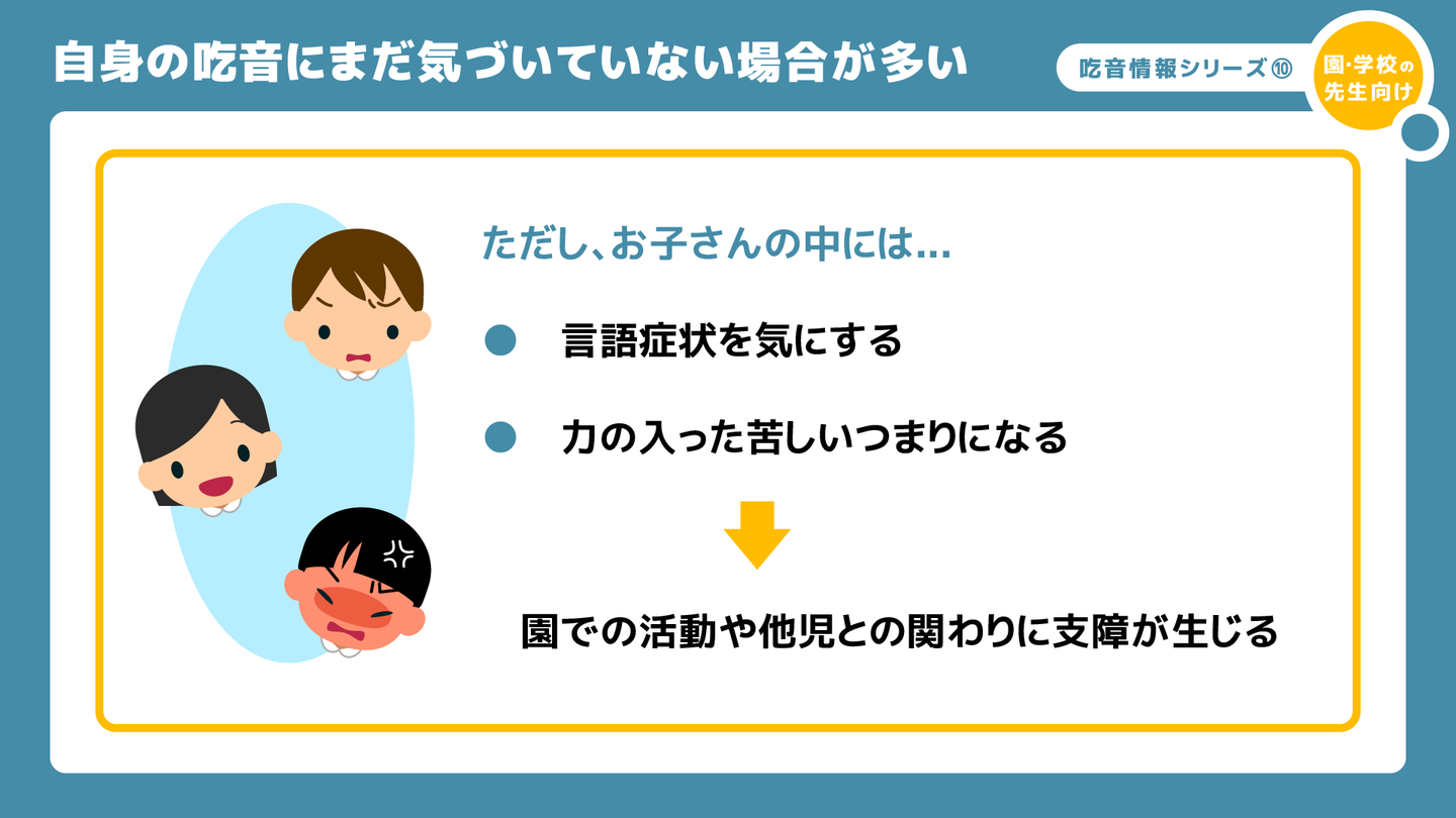 ただし、お子さんの中には、言語症状を気にしたり、力の入った苦しいつまりになったりし、園での活動や他児との関わりに支障が生じるお子さんもいます。