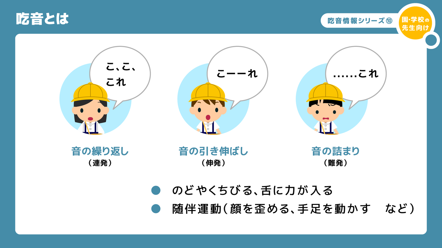 吃音の言語症状が進展すると、「こっ、こっ、これ」、「......これ」のように、のどやくちびる、舌に力が入るようになります。また、言語症状の進展に伴い、顔を歪める、手足を動かすなどの随伴運動が生じることもあります。