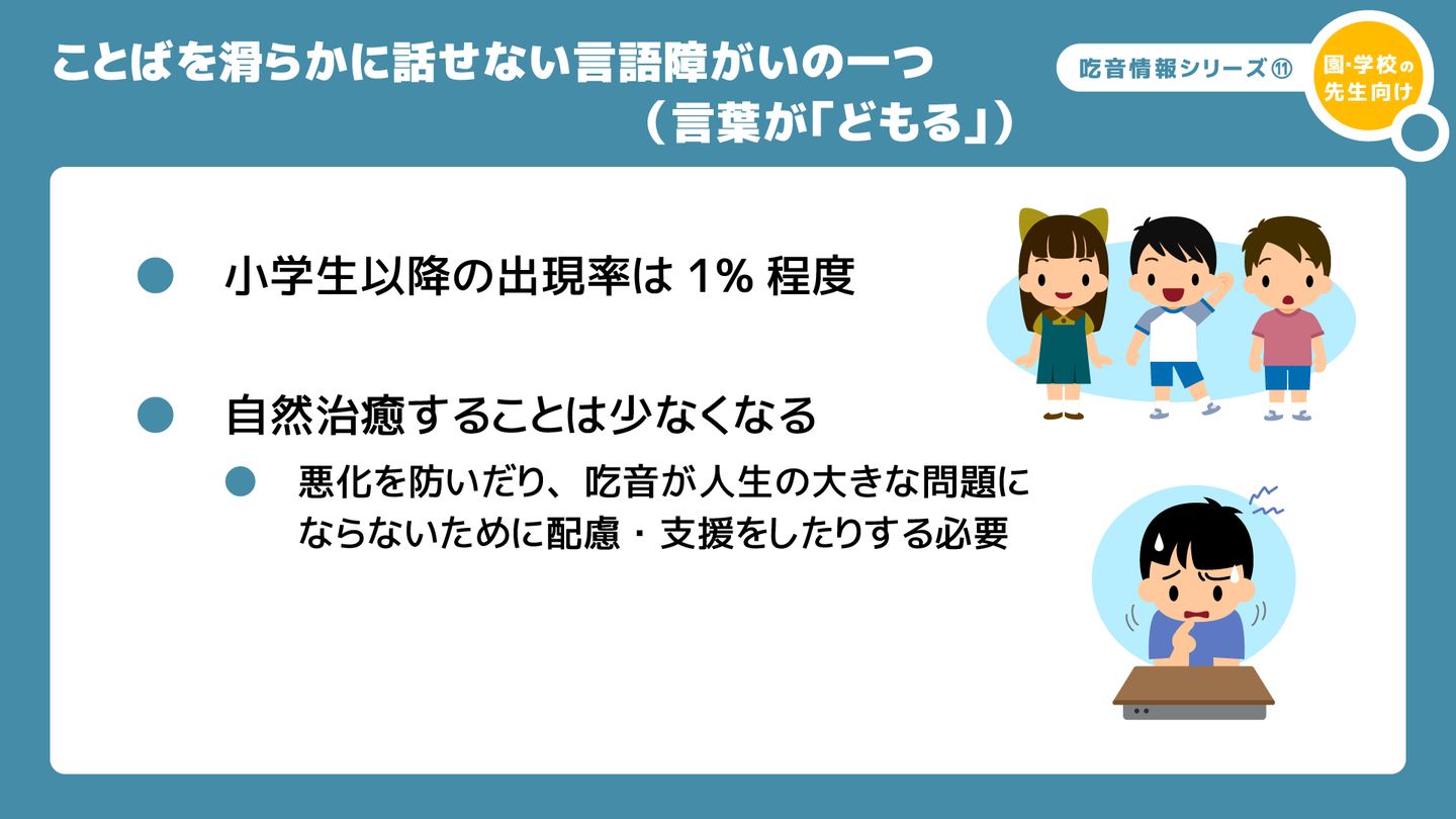 小学生以降の吃音の出現頻度は、1パーセント程度であることが知られています。