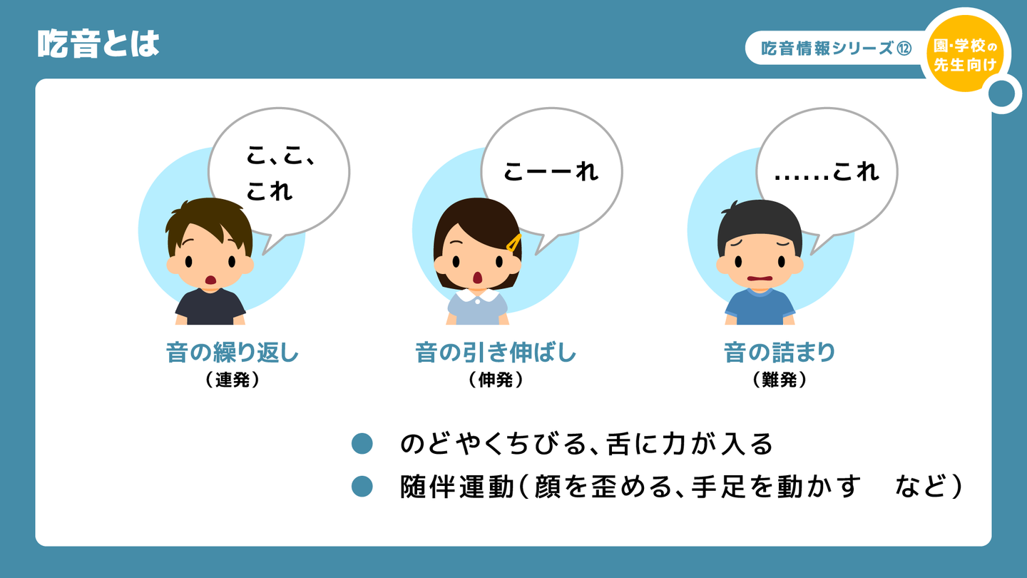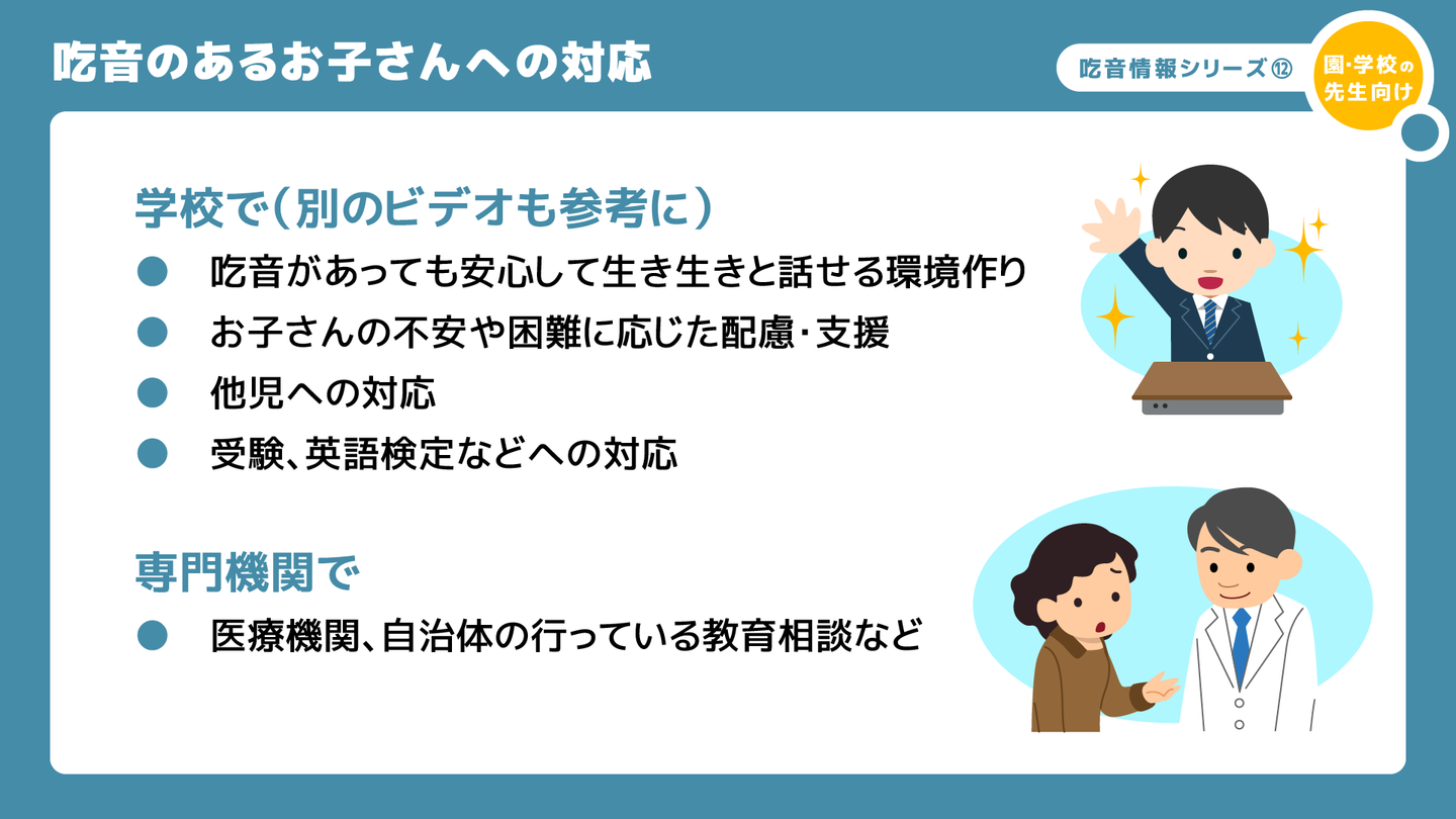 毎日の生活の場である学校では、吃音があっても安心して生き生きと話せる環境作りや、お子さんの吃音への不安や困難に応じた配慮・支援、からかいへの対処など他児への対応、受験や英語検定での特別な配慮の申請への対応などが期待されています。学校におけるお子さんへの対応については、吃音情報シリーズ(14)「吃音のある子どもへの配慮と支援」もご参照下さい。