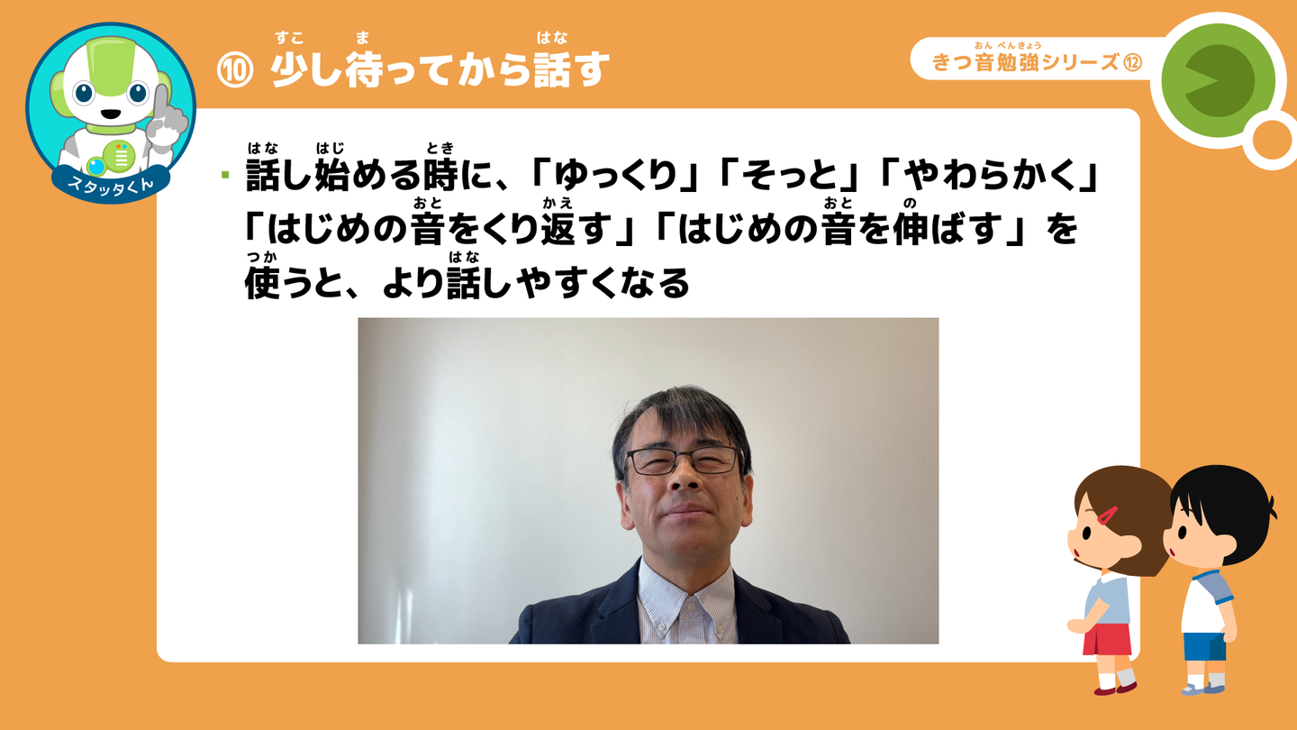スタッタくん: そして、少し待ってから話し始める時は、これまで勉強した、「ゆっくり」「そっと」「やわらかく」「はじめの音をくり返す」「はじめの音を伸ばす」などの話し方を使って話すと、より話しやすくなるよ。