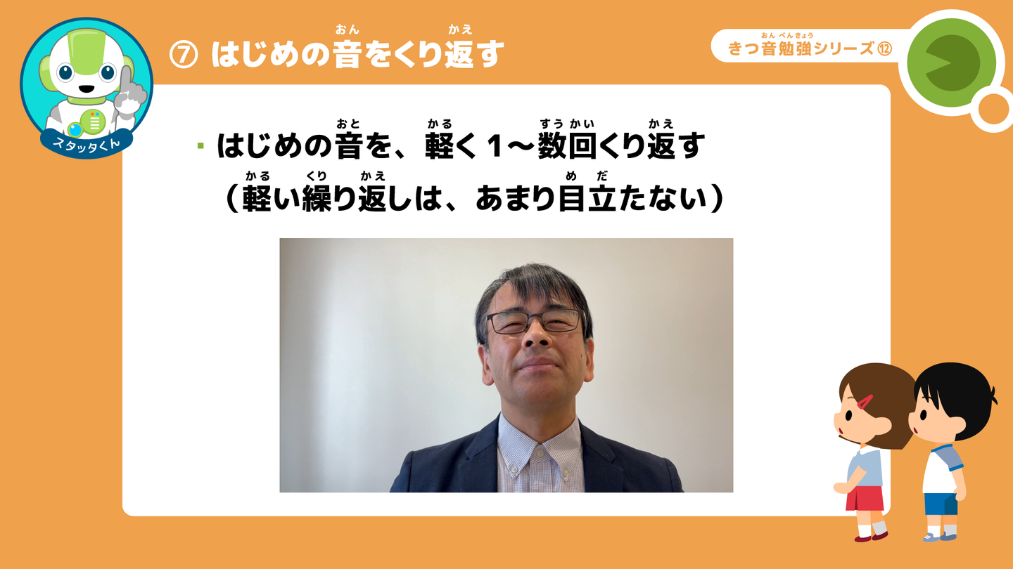 スタッタくん: それじゃあ、吃音が出にくい話し方をいくつか紹介するよ。7つ目は、「はじめの音を繰り返す」だよ。