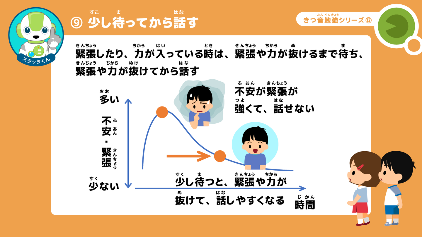 スタッタくん: 9つ目は、「少し待ってから話す」だよ。