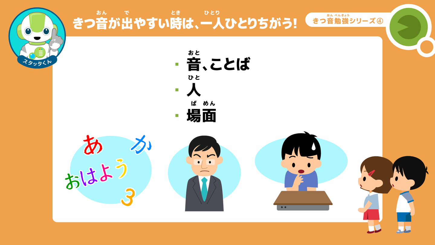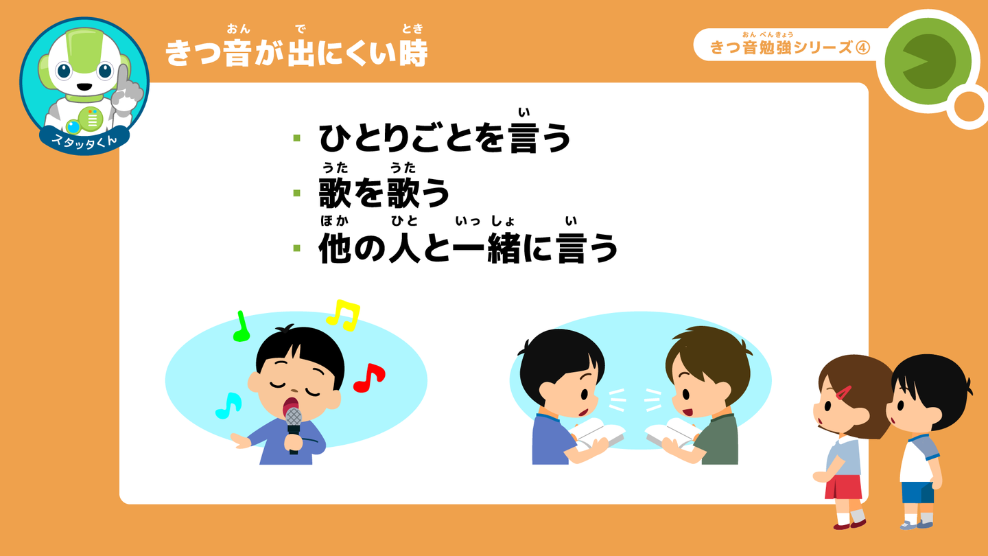 スタッタくん: 例えば、健康調べで「はい、元気です。〇〇さん」と前の人に続けてテンポ良く話す時や、授業の開始の号令を、「きりつ」、「今から、1時間目の勉強を始めます」、「着席」とスラスラと話したりする時とかだよ。