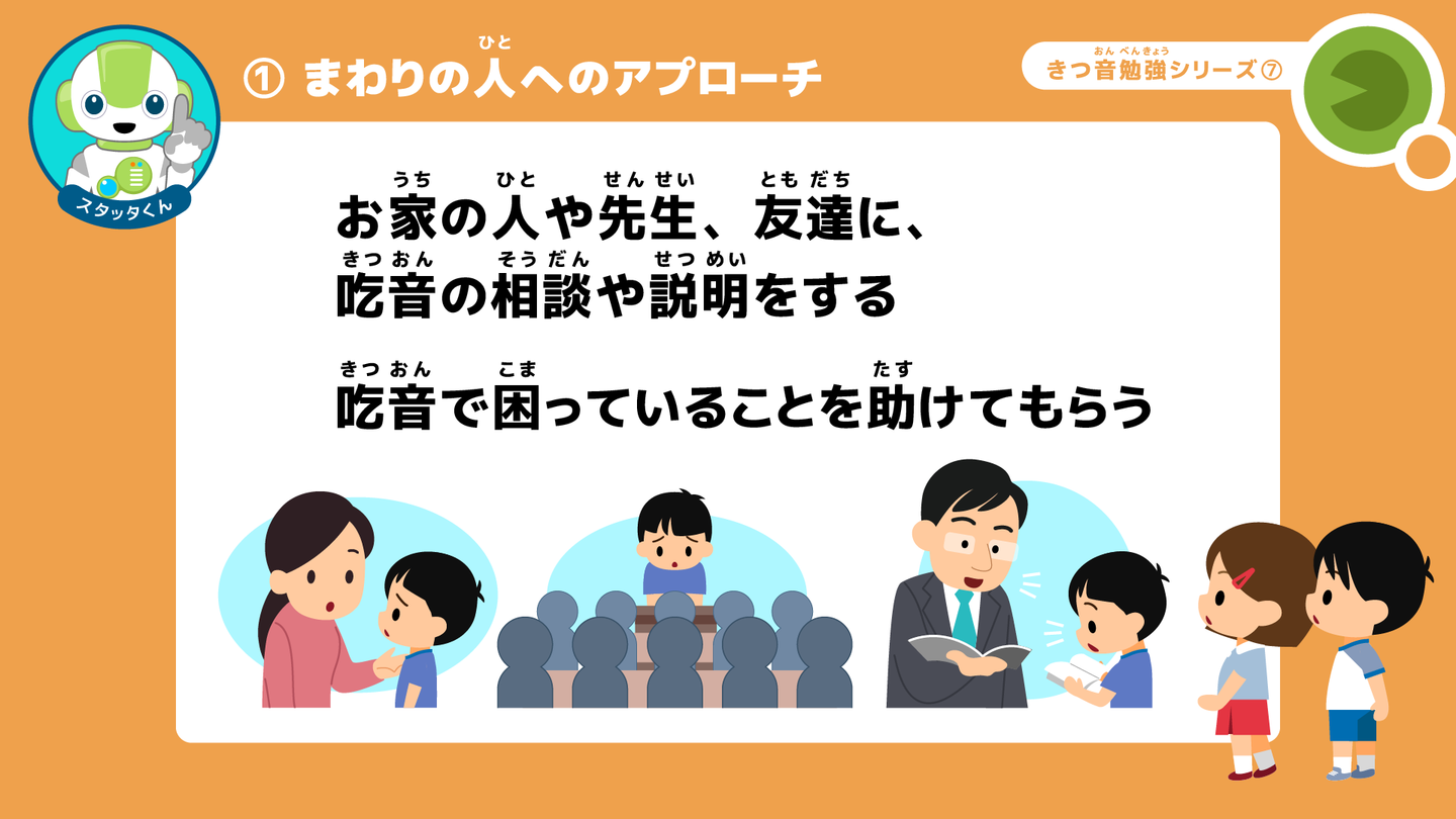 スタッタくん: うん、そうなんだ。たとえば、お家の人や先生、友達に、吃音の相談や説明をしたり、吃音で困っていることを助けてもらったりするんだ。