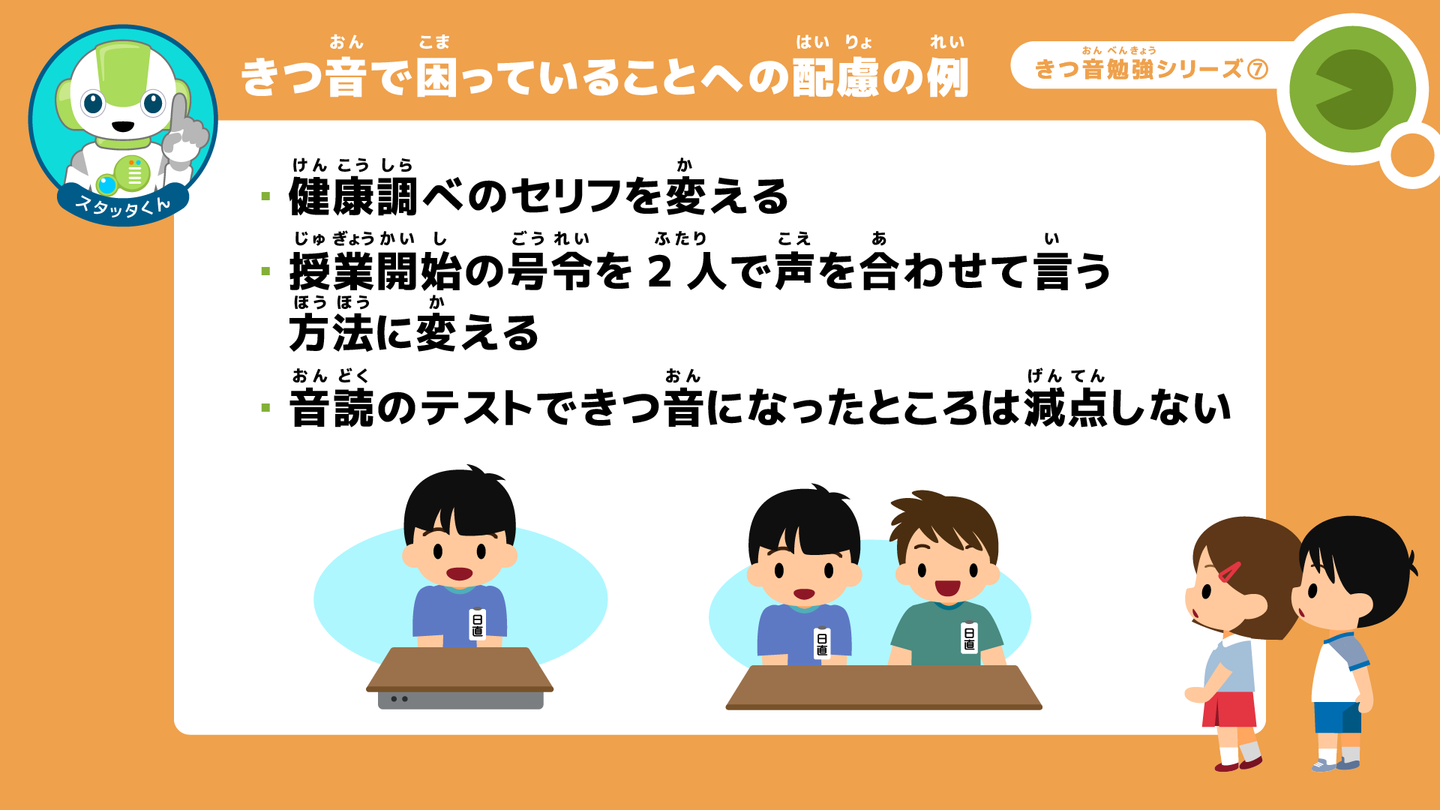 スタッタくん: うん。吃音で困ることを助けてもらうことを「配慮」って言うんだけど、先生に相談すると、例えば、健康調べのセリフの「はい、元気です」の「はい」が吃音で言えない時に、「元気です」だけにセリフを変えてくれたり、授業開始の号令の「今から1時間目の勉強を始めます」が吃音で言えない時、日直当番を2人にして、2人で声を合わせて言う方法に変えてくれたり、音読のテストで、吃音になったところは、減点しないでくれたり