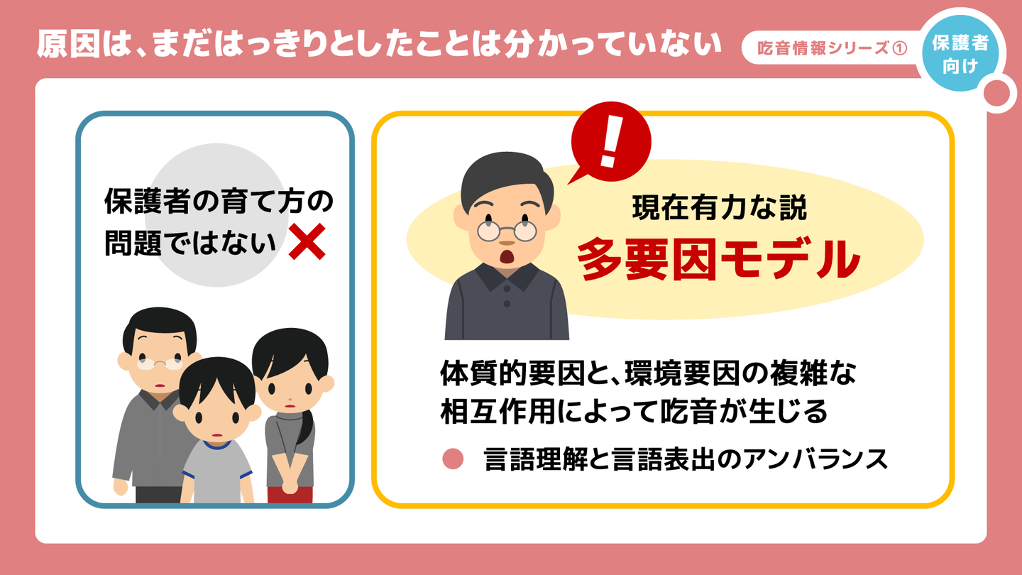 現在、吃音の原因の有力な説となっているのは、「多要因モデル」と呼ばれるものです。これは、体質的要因と、環境要因の複雑な相互作用によって吃音が生じるとするものです。そして、体質的要因の候補として、頭の中には話したいことがたくさんあるのに、それを表すための言語表出や発話運動ができない、言語理解と言語表出のアンバランスが挙げられています。