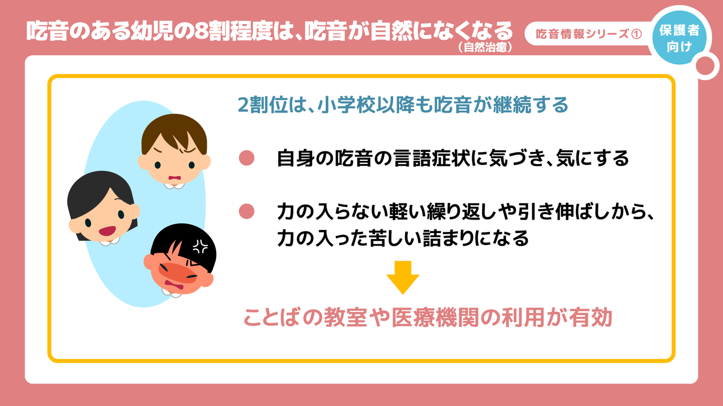 なお、吃音のある幼児のお子さんの2割程度は、小学校以降も吃音が継続します。そうすると、お子さんによっては、自身の吃音の言語症状を気にするようになったり、力の入った苦しいつまりが出てくるようになったりします。その場合は、お子さんの吃音の悪化を防ぎ、言語症状や心理症状を緩和・軽減するために、ことばの教室での通級指導や、医療機関での言語聴覚療法などの専門的な指導・訓練が有効です。