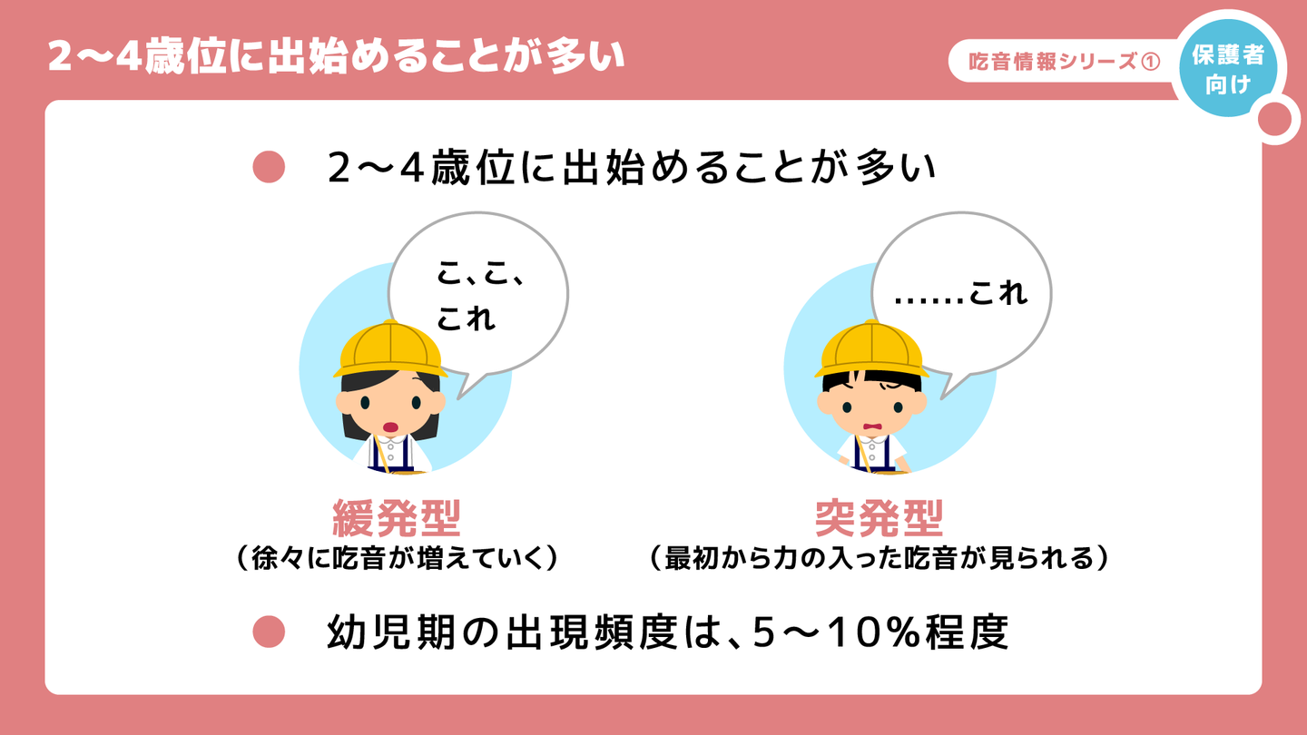 吃音が見られるお子さんの多くは、「こ、こ、これ」のような、力の入らない軽い繰り返しや引き伸ばしから始まり、徐々に吃音が増えていく緩発型です。しかし、最初から「......これ」のような、力の入った繰り返しや引き伸ばしが見られる突発型のお子さんもいます。