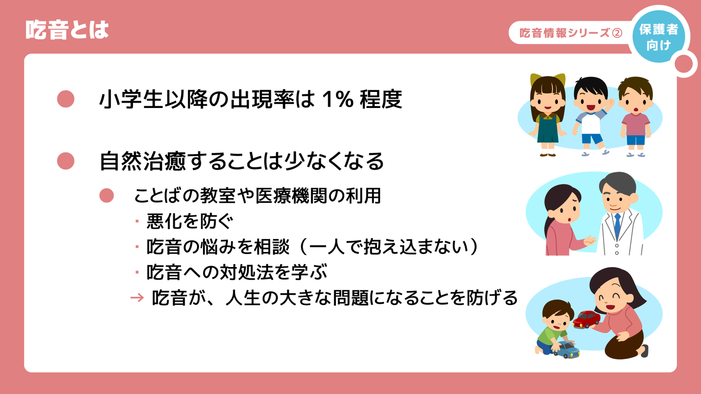 などを行います。このような対応をすることで、吃音が、今後、人生の大きな問題になることを防ぐことができます。