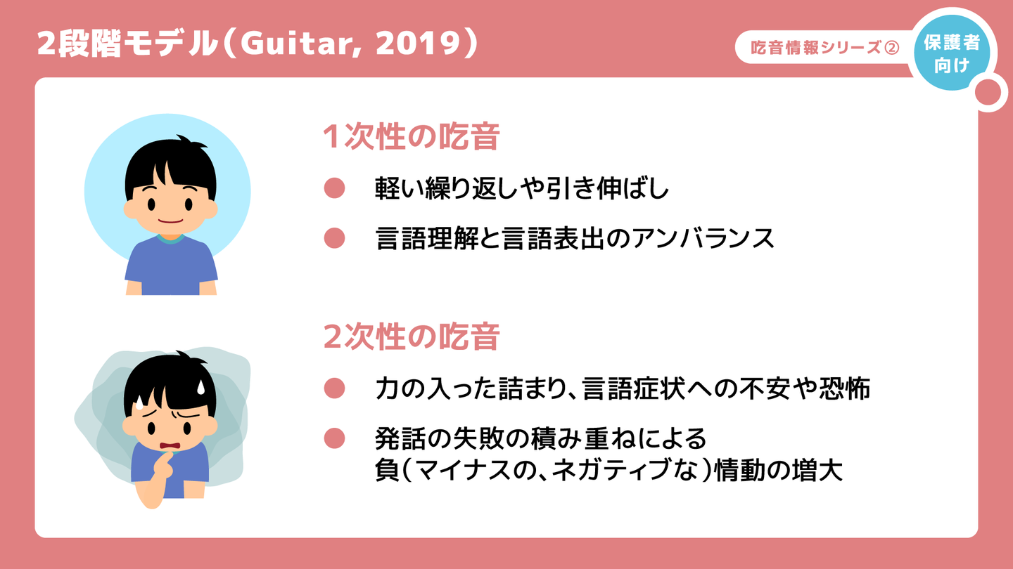 2次性の吃音といわれる、力の入ったつまりや、言語症状への不安や恐怖が生じる要因には、発話の失敗の積み重ねによる負、つまり、マイナスの、ネガティブな、情動の増大があると考えられます。