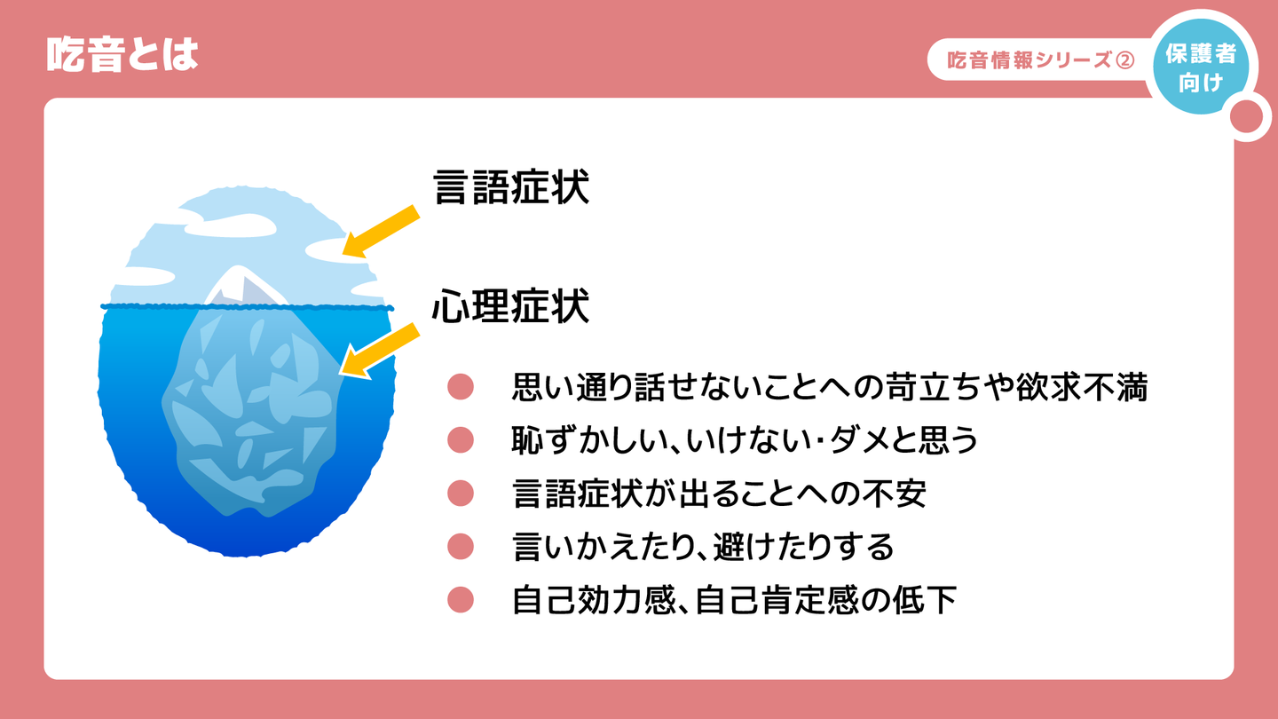 個人差はありますが、小学生になると、多くのお子さんは、自身の吃音の言語症状を、気にするようになります。そうすると、言語症状に加え、心理症状が見られるようになります。シーアンというアメリカの吃音の研究者は、吃音の問題は氷山のようなものであり、外から見える言語症状だけでなく、外から見えない心理症状に注意する必要があると述べています。