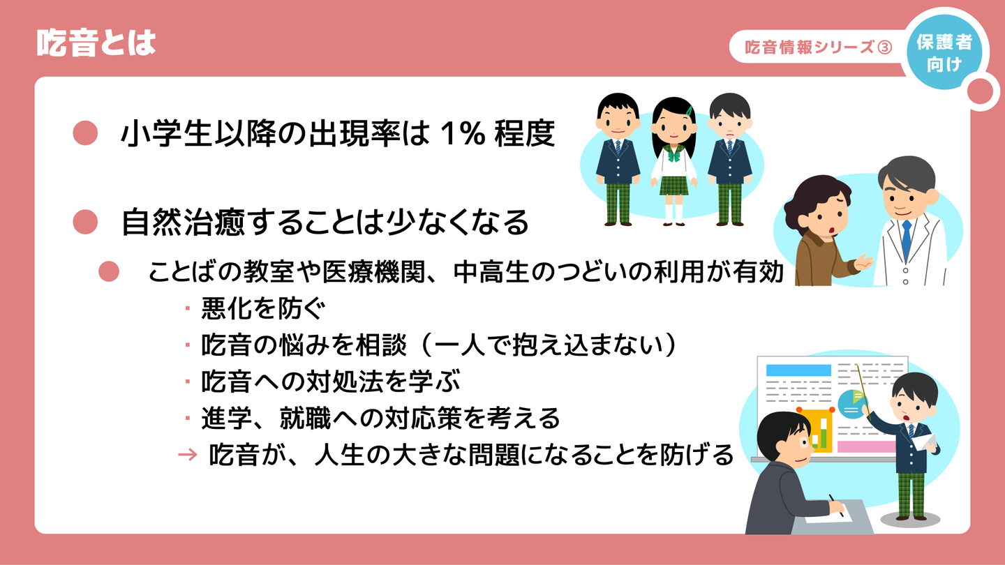 なお、中高生の時期の吃音は、不安障害の一つで、人から注目されることに強い不安や恐怖を抱く社交不安障害との合併が多いことも知られています。