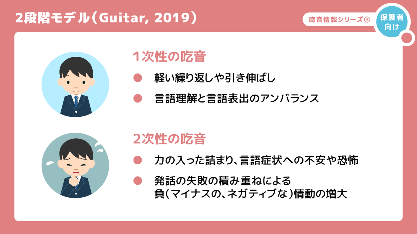 2次性の吃音といわれる、力の入ったつまりや、言語症状への不安や恐怖が生じる要因には、発話の失敗の積み重ねによる負、つまり、マイナスの、ネガティブな、情動の増大があると考えられます。