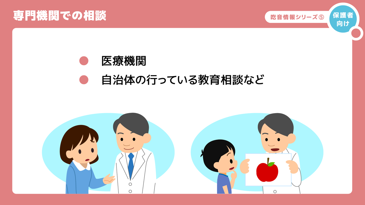 幼児期の吃音の相談や指導・訓練を行っている専門機関には、言語聴覚士ということばのリハビリテーションの専門職がいる医療機関があります。また、都道府県や区市町村などの自治体の中には、「ことばの相談」、「療育相談」などの形で、吃音のあるお子さんの相談を行っているところがあります。お子さんに吃音が見られる場合は、一度、これらの専門機関で、相談されることをお勧めします。