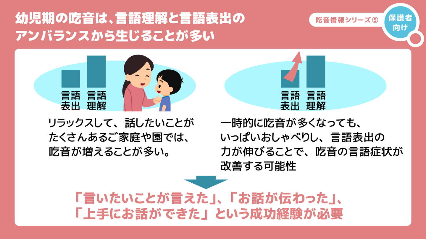 幼児期の吃音は、頭の中には話したいことがたくさんあるのに、それを表すための言語表出や発話運動ができない、言語理解と言語表出のアンバランスから生じることが多いと考えられています。