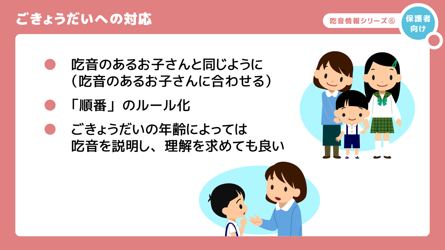 ごきょうだいへの対応については、「ゆっくり、ゆったり、短めに」などの話しかけ方は、吃音のあるお子さんに合わせ、同じようにすると良いでしょう。