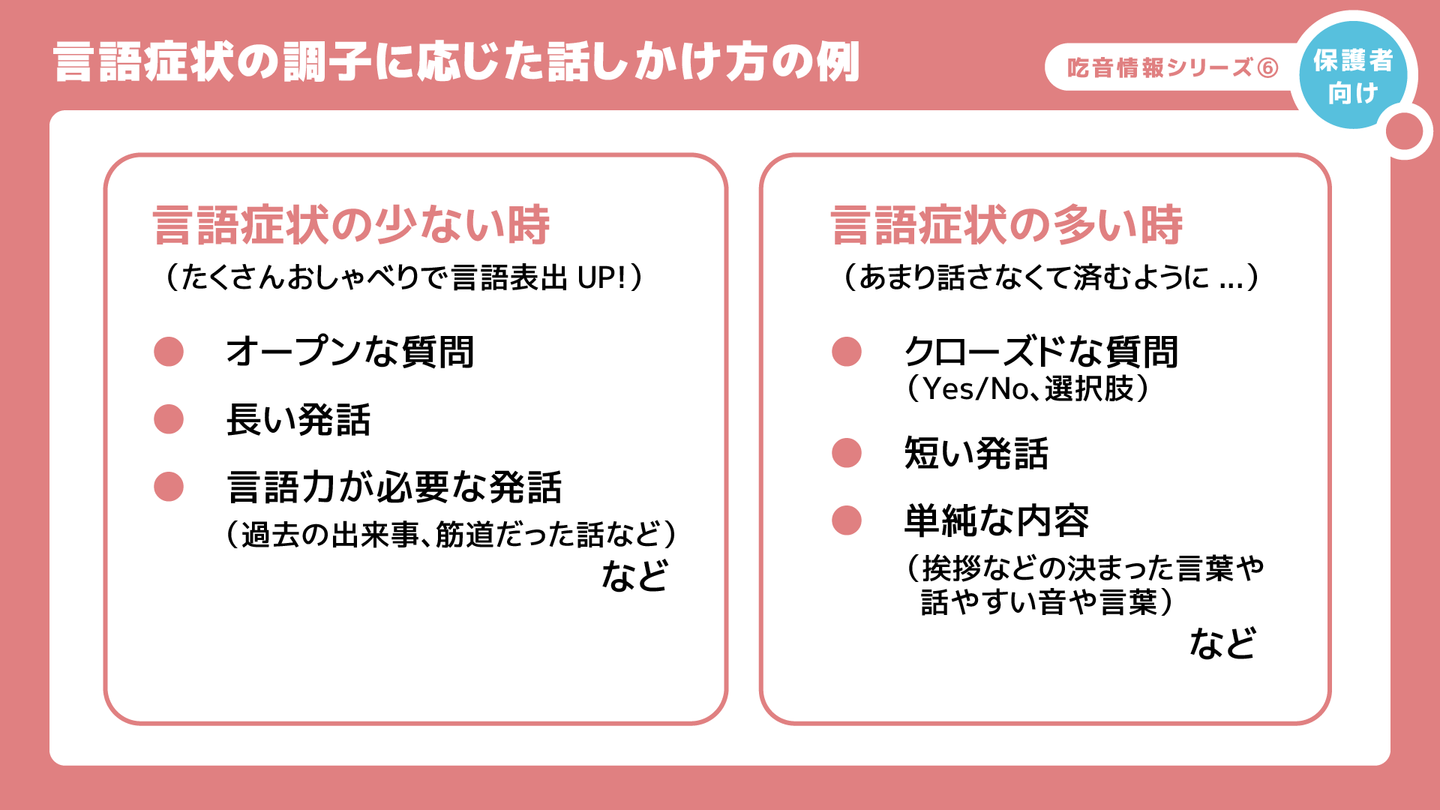 そして、言語症状が多い時は、あまり話さなくて済むように、「Aちゃんとあそんだの?」、「オレンジジュースとリンゴジュースどっちがいい?」などYes/Noや選択肢で答えるクローズドな質問をしたり、短い発話や挨拶などの決まった言葉や、お子さんが話しやすい音や言葉など、言語症状が出にくい発話を引き出すようにします。