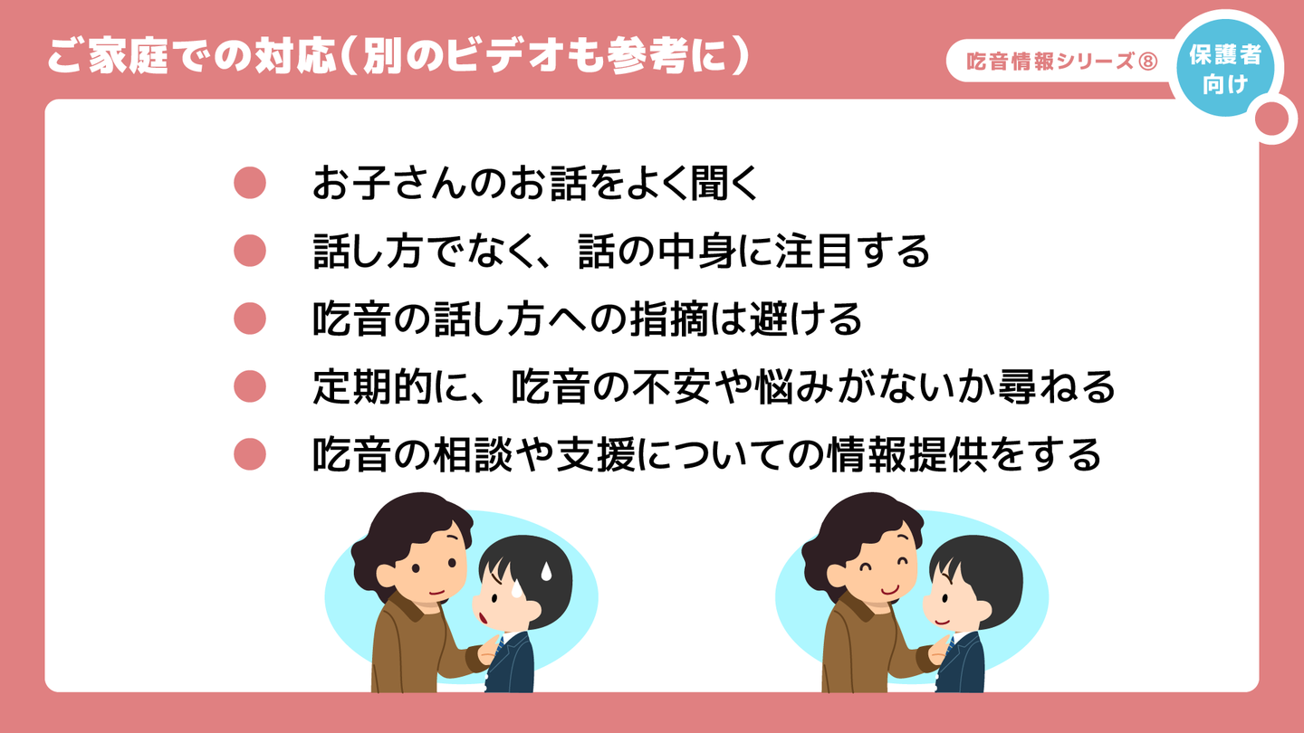 2つ目は、「吃音の悩みや相談にきちんと対応する」ことです。学校の相談室の先生や、友達、言語聴覚士など専門職の先生、中高生のつどいで知り合った同じ吃音のある仲間など、親御さん以外にも相談できる人がいることが望ましいでしょう。