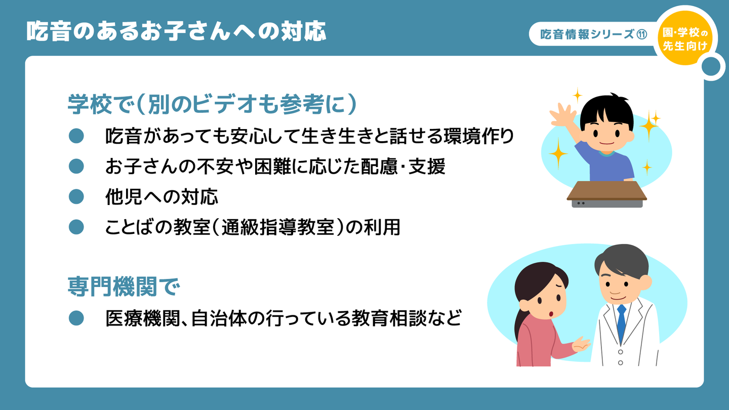 毎日の生活の場である学校では、吃音があっても安心して生き生きと話せる環境作りや、お子さんの吃音への不安や困難に応じた配慮・支援、からかいへの対処など他児への対応が期待されています。また、ことばの教室の利用も大変有効です。学校におけるお子さんへの対応については、吃音情報シリーズ(14)「吃音のある子どもへの配慮と支援」もご参照下さい。
