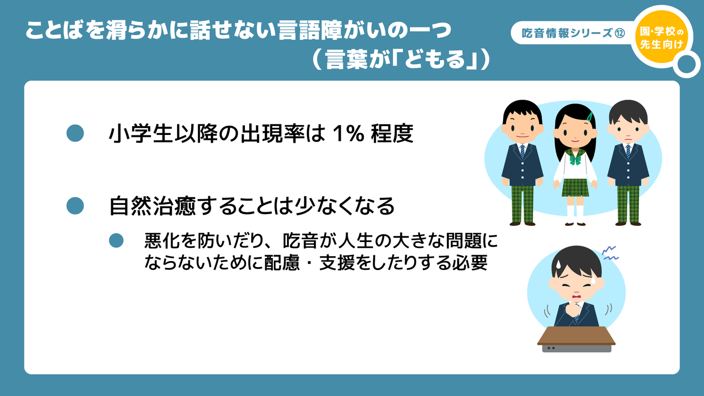 小学生以降の吃音の出現頻度は、1パーセント程度であることが知られています。