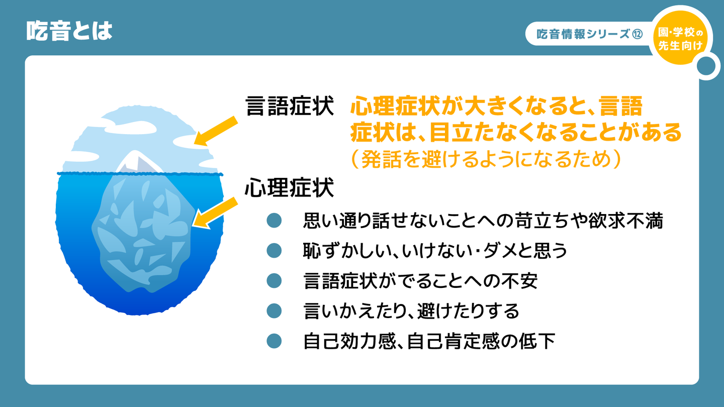 シーアンというアメリカの吃音の研究者は、吃音の問題は氷山のようなものであり、外から見える言語症状だけでなく、外から見えない心理症状に注意する必要があると述べています。
